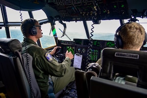 Maj. Matthew Heisel, 327th Airlift Squadron pilot, participates in a training flight to enhance readiness at Little Rock Air Force Base, Arkansas, July 22, 2021. The air crew conducted a low-cost, low-altitude cargo drop, a method that increases cargo delivery accuracy. (U.S. Air Force photo by
