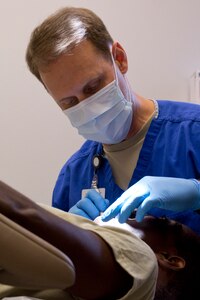 U.S. Air Force Reserve Lt. Col. Kyle Wendfeldt, a 913th Aerospace Medical Squadron dentist, performs a dental examination during the Unit Training Assembly weekend at Little Rock Air Force Base, Ark., Aug. 5, 2017. The medical squadron helps ensure 913th Airlift Group Airmen are medically qualified